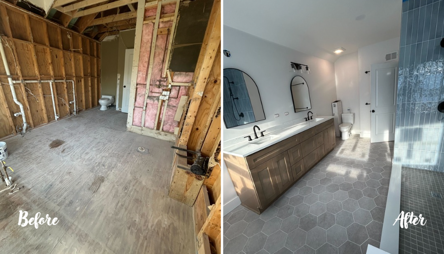 The “After” photo speaks for itself—a stunning transformation into a bright, contemporary master bath designed for both comfort and style.